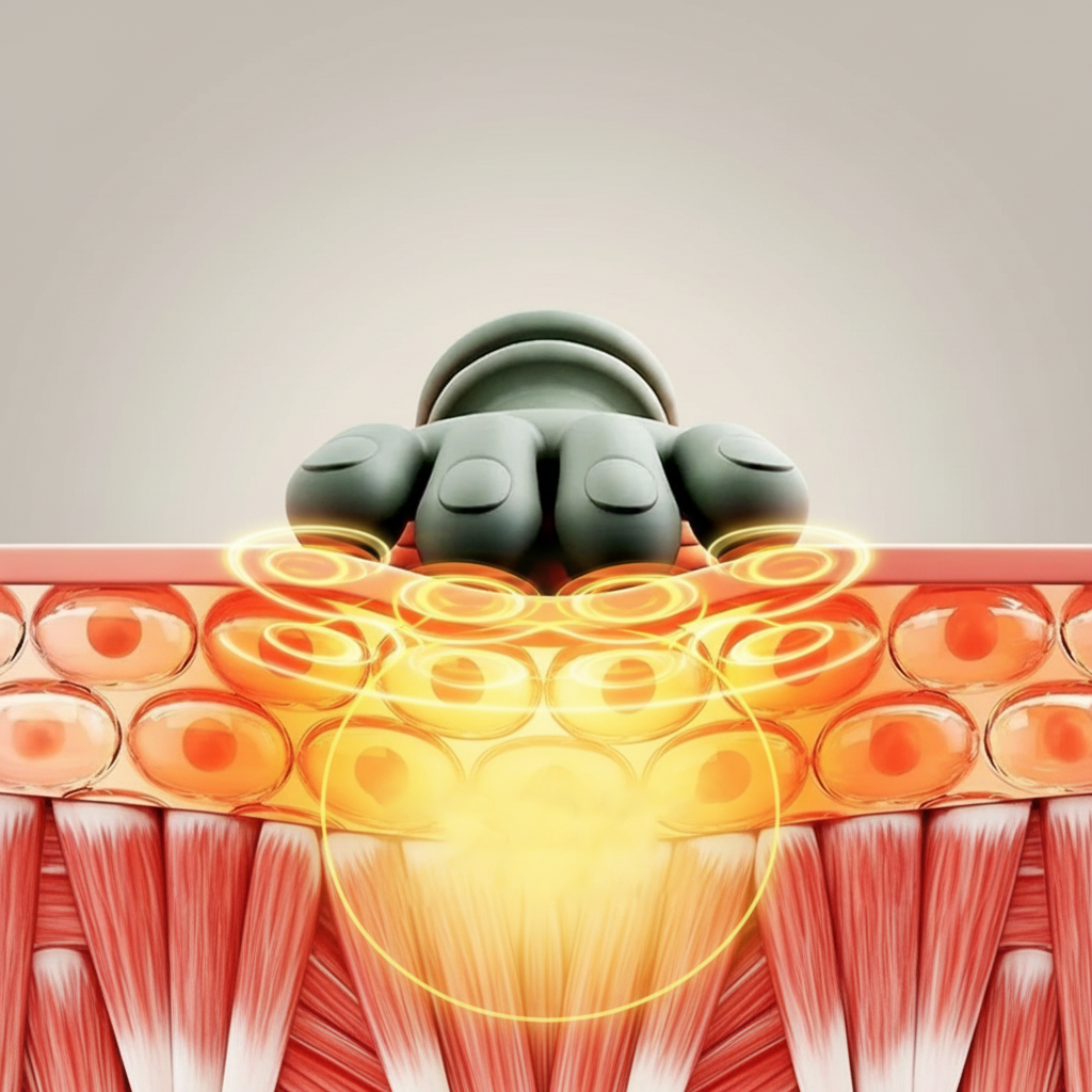 Därefter appliceras långsam, rytmisk knådning från flera vinklar — inspirerad av hur händer arbetar vid manuell massage.